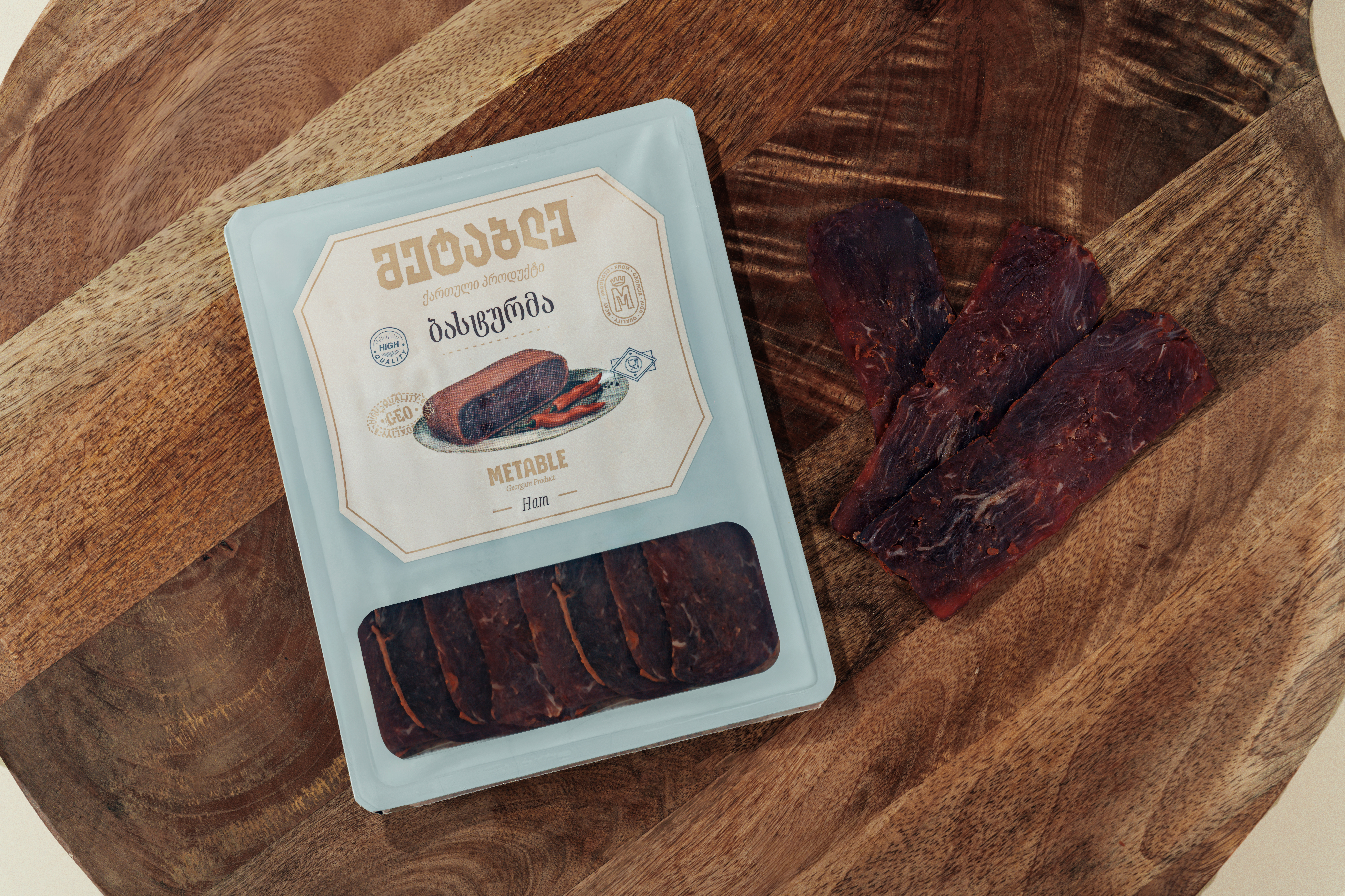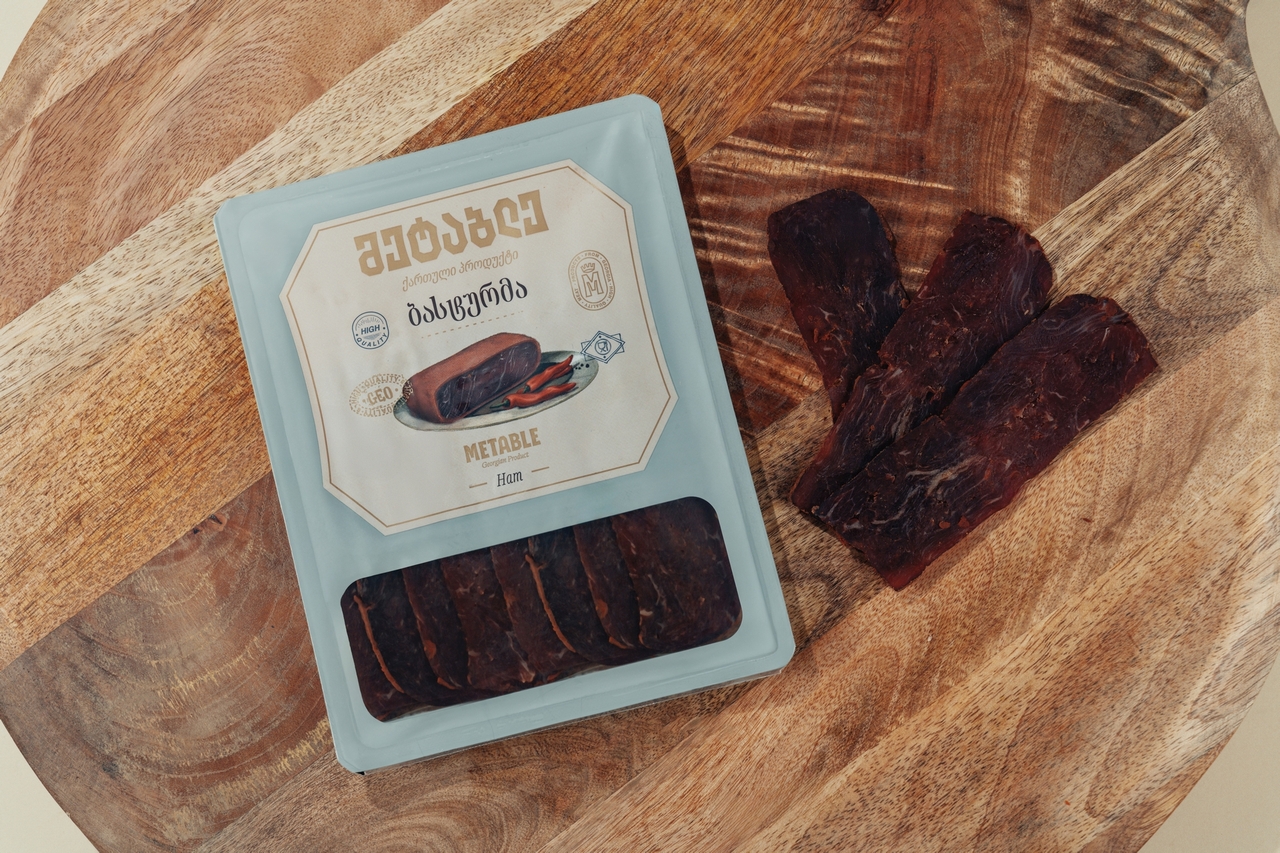 საქონლის ხორცი - 80%გ, I/ხ ხორბლის ფქვილი, მარილი, წიწაკა წითელი, უცხო სუნელი, ნიორი, საკვები უჯრედისი, მალტოდექსტრინი, დექსტროზა, სტაბილიზატორი - ტრანსგლუტამინაზა; შეფერილობის ფიქსატორი - ნატრიუმის ნიტრიტი; საღებავი - კარმინი